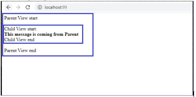 As we have seen in the ParentComponent, the messageFromChild was being set by child component’s childsendingmessage, we are using the same in the expression in the ParentView.html {{ messageFromChild }} and the value will be set accordingly.