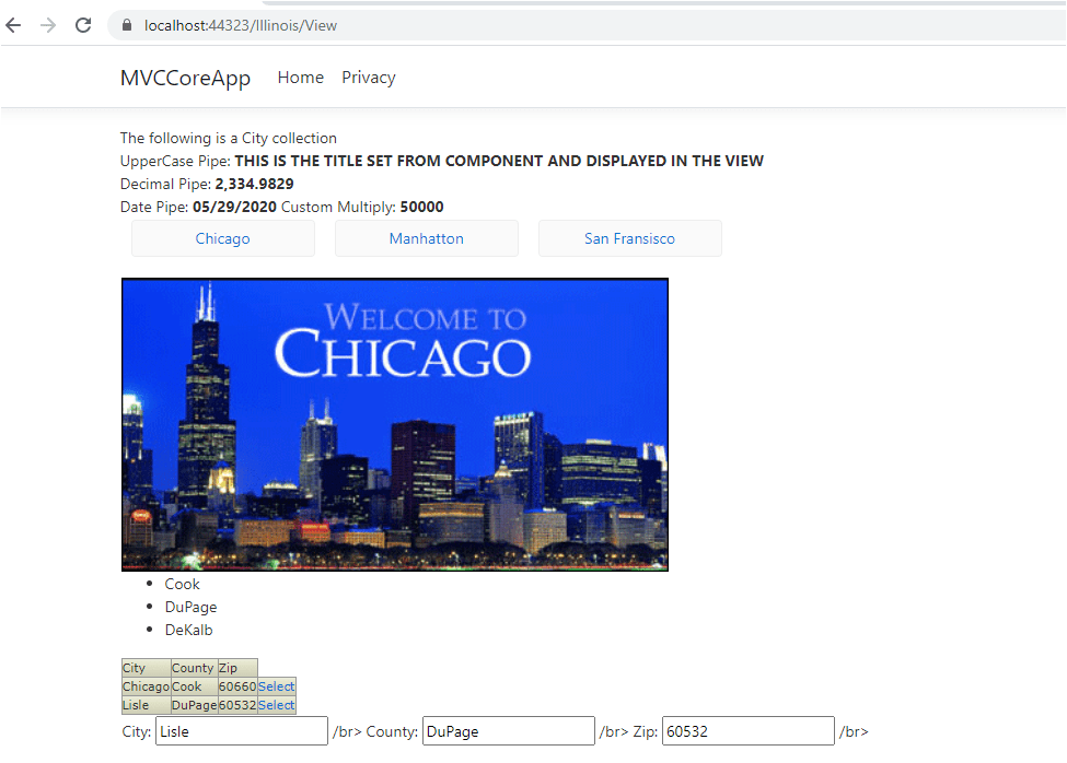 The integrated Angular application now works with our MVC Core application. In this way we can integrate any Angular app in any other consuming app too. This is a one time process as our MVC Core just needs the link to the javascript files. Even if the angular team is still working on new features, it wont affect the configuration in the index.cshtml and the src file is already linked to the Angular folder.