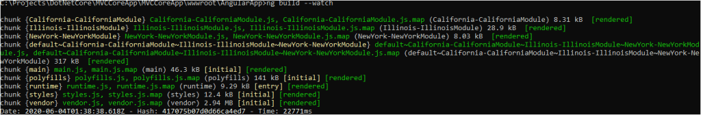 Important thing to note here is that we cannot do ng serve to run the application. If we do that, Angular app will run on seperate port and our MVC Core app will run on another port and we do not want that to happen, we know typescript will convert and bundle the files to javascript files, so that will be easily integrated in the consuming application, so we will copy the bundled js files tags created in the dist folder to the mvc core application’s index.cshtml page.