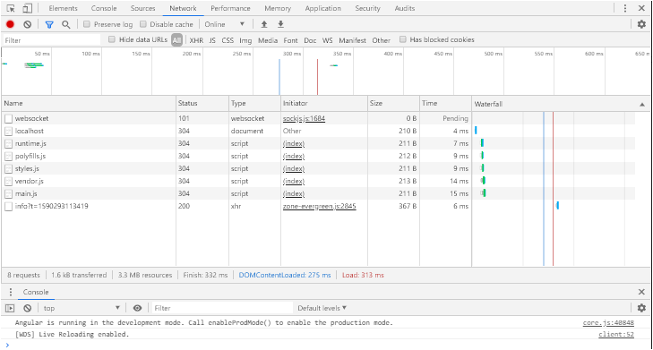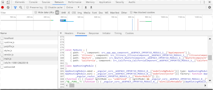 In the previous example with Routing, there was problem wherein all the 3 components (IllinoisComponent, NewYorkComponent, CaliforniaComponent) were loaded together on page load. This can be seen on Chrome >> Developer Tools >> Network tab under Main.js file.