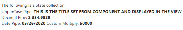 As you can see from above example, title has been formatted to Upper case. The decimal pipe will format the number based on the ‘2.3-4’ where 2 is the main integer with atleast 4 decimal places. Similarly, date pipe will format the myDate in ‘MM/dd’yyyy’ format.