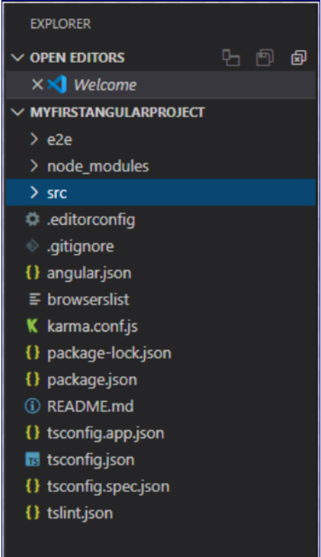 All the solution file that are opened will be listed here. It provides option to close or save a file or all files. MyFirstAngularProject is the solution folder and it lists below sub folders.